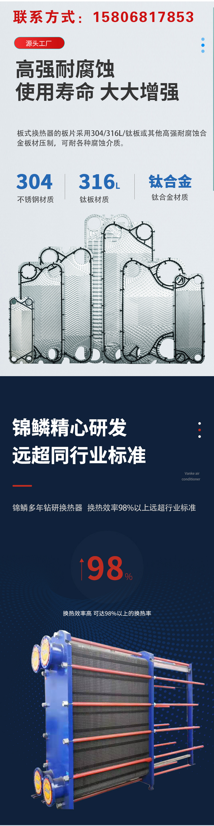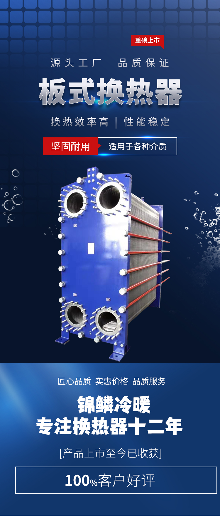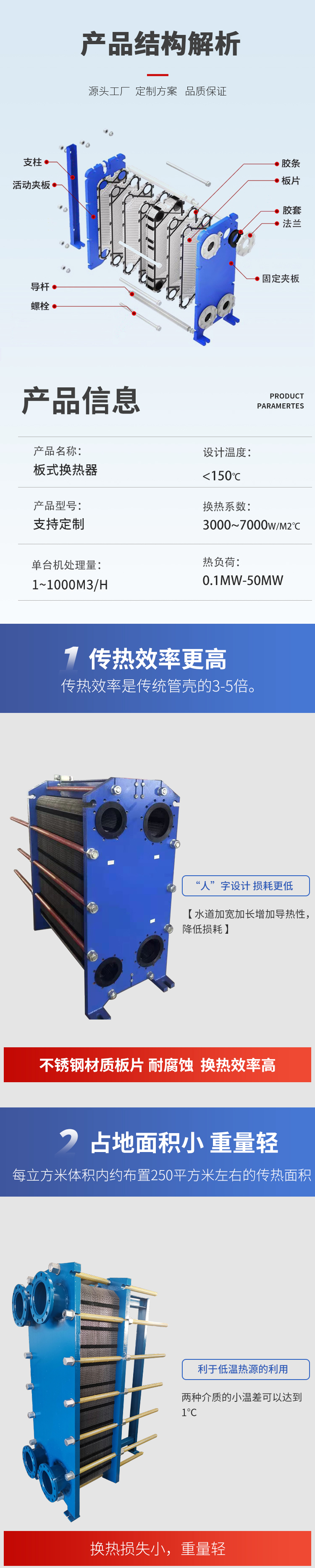 板式換熱器是由一系列具有一定波紋形狀的金屬片疊裝而成的一種新型高效換熱器。各種板片之間形成薄矩形通道,通過板片進(jìn)行熱量交換。板式換熱器是液-液、液-汽進(jìn)行熱交換的理想設(shè)備。它具有換熱效率高、熱損失小、結(jié)構(gòu)緊湊輕巧、占地面積小、安裝清洗方便、應(yīng)用廣泛、使用壽命長等特點(diǎn)。在相同壓力損失情況下,其傳熱系數(shù)比列管式換熱器高3-5倍,占地面積為管式換熱器的三分之一,熱回收率可高達(dá)90%以上。