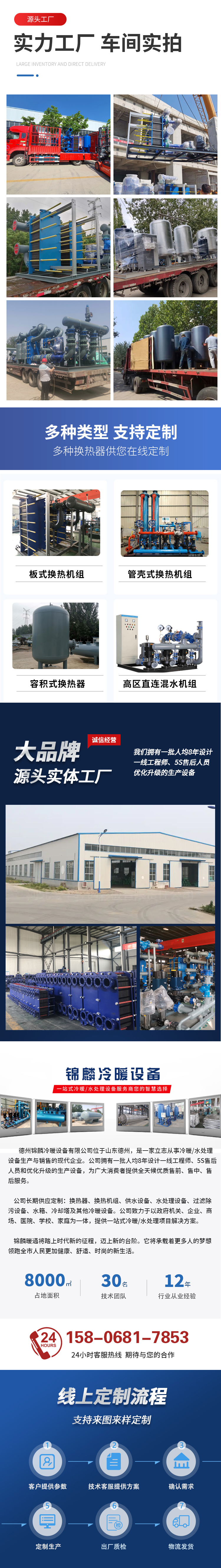 公司長期供應(yīng)定制:換熱器、換熱機(jī)組、供水設(shè)備、水處理設(shè)備、過濾除污設(shè)備、水箱、冷卻塔及其他冷暖設(shè)備。公司致力于以政府機(jī)關(guān)、企業(yè)、商場、醫(yī)院、學(xué)校、家庭為一體,提供一站式冷暖/水處理項(xiàng)目解決方案。