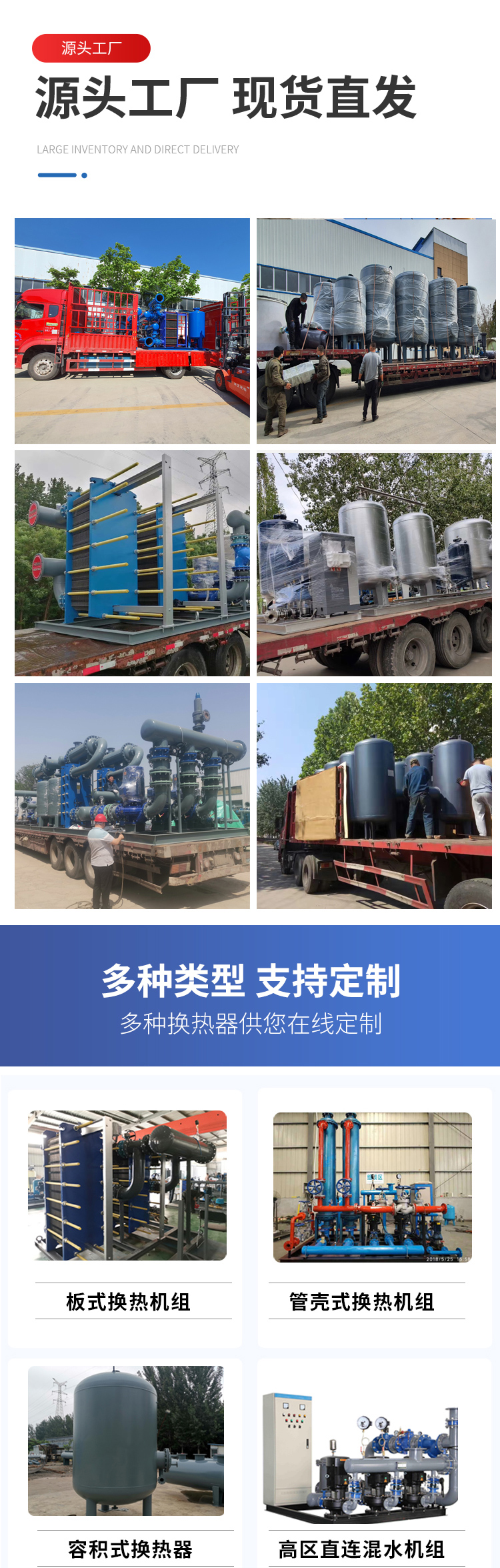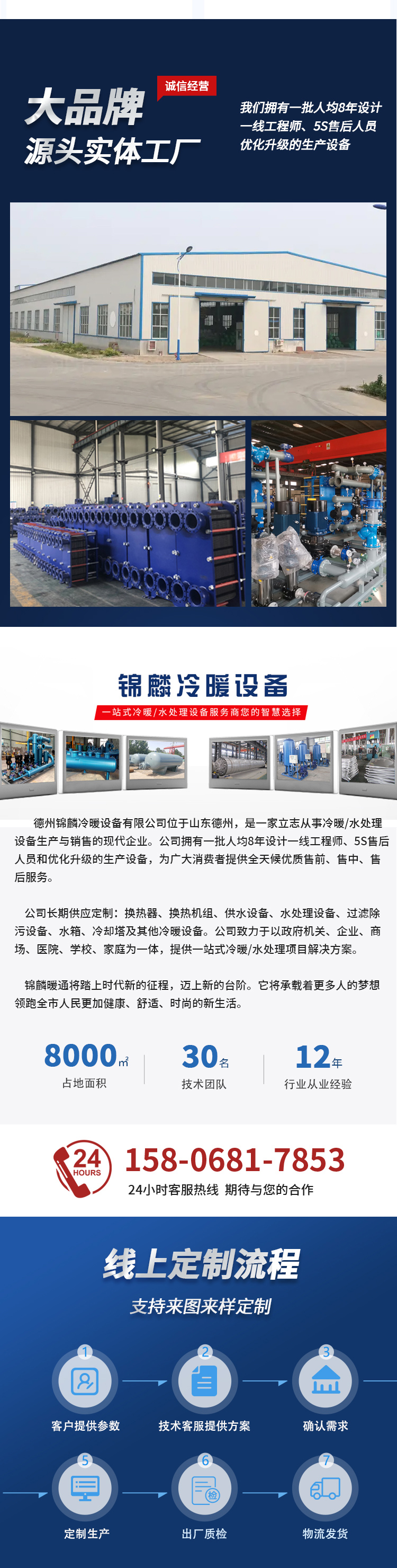 公司長期供應(yīng)定制:換熱器、換熱機組、供水設(shè)備、水處理設(shè)備、過濾除污設(shè)備、水箱、冷卻塔及其他冷暖設(shè)備。公司致力于以政府機關(guān)、企業(yè)、商場、醫(yī)院、學(xué)校、家庭為一體,提供一站式冷暖/水處理項目解決方案。