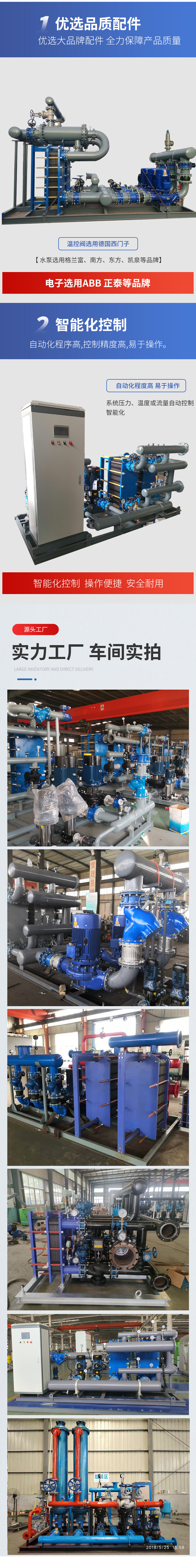 應(yīng)用于同一熱網(wǎng)中既有高溫水采暖系統(tǒng)又有低溫水采暖系統(tǒng),通過該設(shè)備向低溫水采暖系統(tǒng)供熱,從而實現(xiàn)低溫的采暖系統(tǒng)與高溫的外網(wǎng)直接連接。該設(shè)備不僅克服了隔絕式接熱系統(tǒng)的諸多鐵點,而且節(jié)約熱能及電能,自動化程度高,運行穩(wěn)定,結(jié)構(gòu)緊湊,占地面積小。