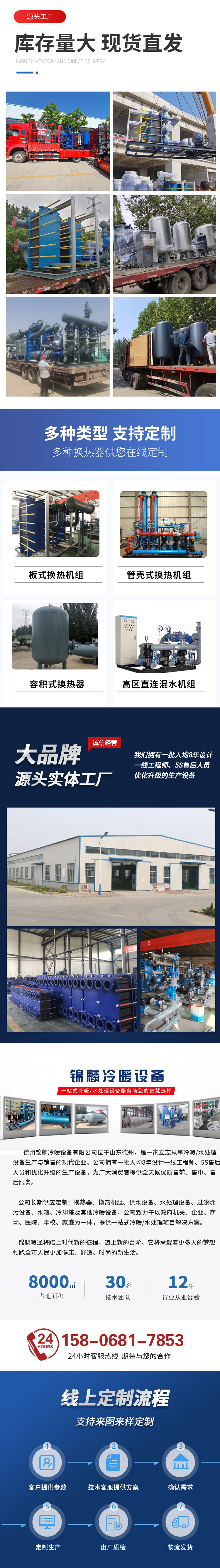 公司長期供應(yīng)定制:換熱器、換熱機組、供水設(shè)備、水處理設(shè)備、過濾除污設(shè)備、水箱、冷卻塔及其他冷暖設(shè)備。公司致力于以政府機關(guān)、企業(yè)、商場、醫(yī)院、學(xué)校、家庭為一體,提供一站式冷暖/水處理項目解決方案。