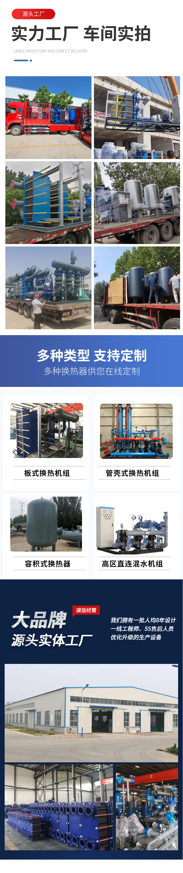 公司長期供應(yīng)定制:換熱器、換熱機組、供水設(shè)備、水處理設(shè)備、過濾除污設(shè)備、水箱、冷卻塔及其他冷暖設(shè)備。公司致力于以政府機關(guān)、企業(yè)、商場、醫(yī)院、學(xué)校、家庭為一體,提供一站式冷暖/水處理項目解決方案。